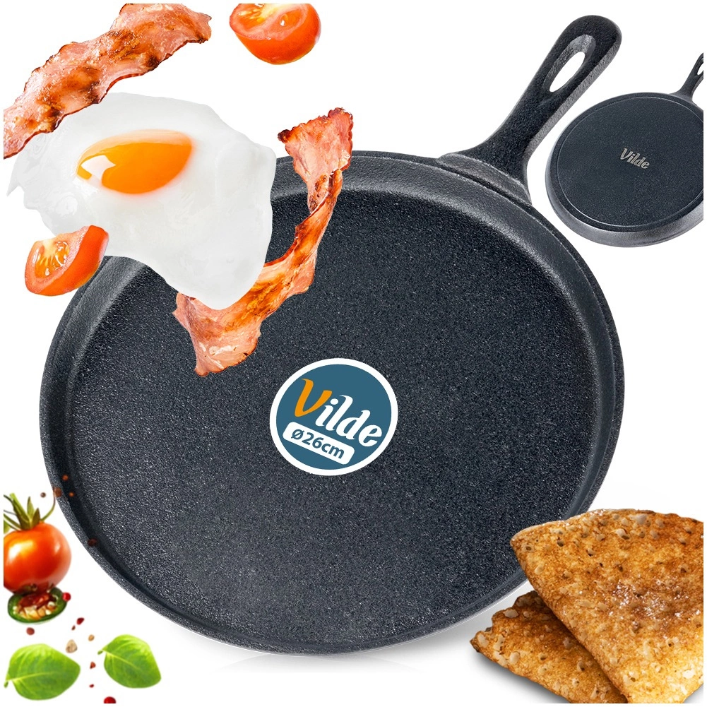 Deze gietijzeren pan met een diameter van 26 cm biedt een brede, lage en volledig vlakke bakplaat, ideaal voor dunne pannenkoeken, tortilla’s of platbroden. Gietijzer zorgt voor egale garing en langdurige warmtebehoud, zodat het eten langer warm blijft. Het ergonomisch gevormde oor met ophangoog vergemakkelijkt hanteren en opbergen.