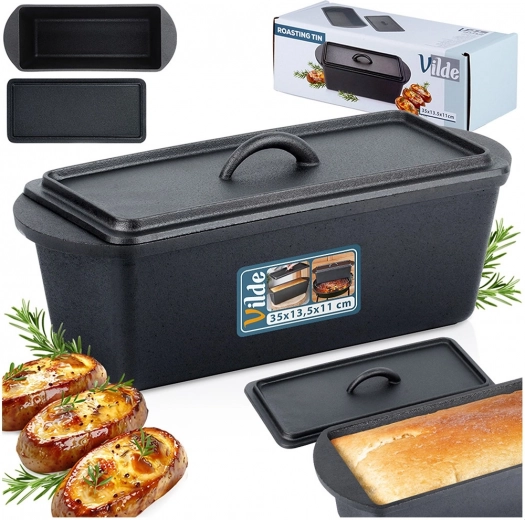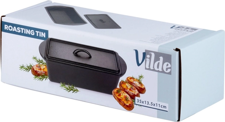 Robuuste ijzeren broodvorm met deksel voor perfect thuis bakken. Dankzij het gietijzeren materiaal accumuleert en verdeelt hij de warmte gelijkmatig, is bestand tegen hoge temperaturen en geschikt voor kookplaat, grill en oven. Inhoud 3 l, afmetingen 35 × 13,5 × 11 cm (zonder deksel), hoogte met deksel 14 cm. Ideaal voor toastbrood, tulbanden, gehaktbrood en braadgerechten. Merk VILDE.