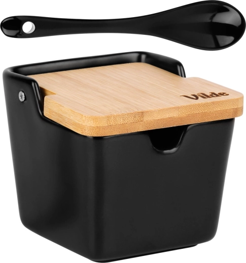 Elegante zwarte suikerschaal met een inhoud van 250 ml, voorzien van een kantelbaar bamboe deksel en een praktische uitsparing voor een lepeltje. Ideaal voor dagelijks serveren en bewaren van suiker of kruiden. Inclusief bijpassend keramisch lepeltje. De combinatie van keramiek en bamboe zorgt voor een modern uiterlijk, gemakkelijke dosering en bescherming van de inhoud tegen vuil.