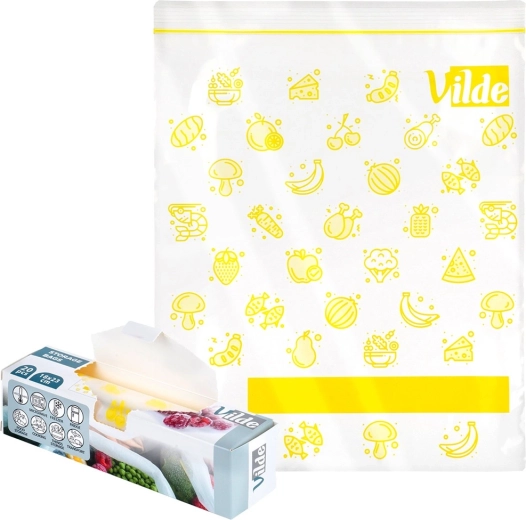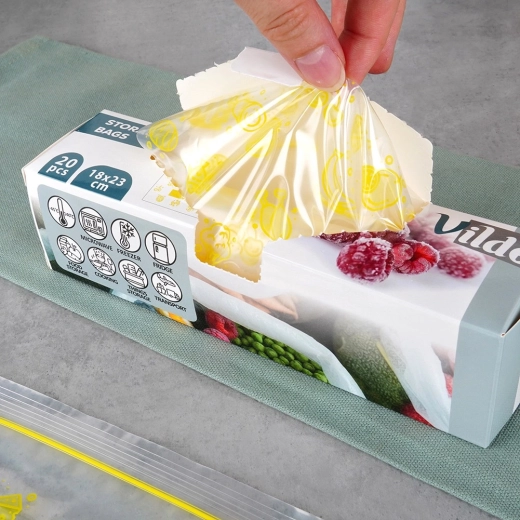 Dankzij het brede temperatuurbereik van -45 °C tot 140 °C zijn de zakjes geschikt voor invriezen, koelen en opwarmen in de magnetron. Een handig vakje voor label helpt bij het dateren en markeren van ingrediënten.