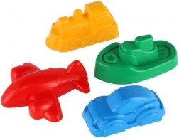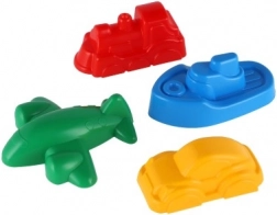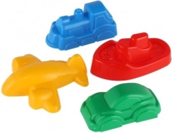 4 stuks plastic vormpjes (trein, boot, vliegtuig, auto)