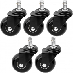 Praktische set van vijf vervangende wielen voor bureaustoelen met een stille en soepele beweging op harde vloeren. De rubberen laag minimaliseert geluid en trillingen en beschermt de vloer tegen krassen. Dankzij de wieldiameter van 50 mm en de metalen pen van 10 mm passen ze eenvoudig op een breed scala aan stoelen.