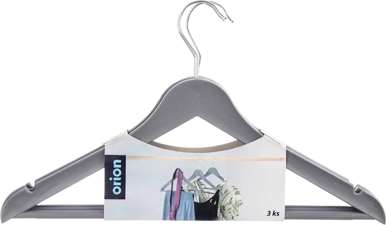 Praktische set van drie grijze hangers met een draaibare haak voor overzichtelijke opslag van kleding in de garderobe en in de winkel. De hangers hebben een universele toepassing, antislip-inkepingen op de schouders en een horizontale stang voor broeken of sjaals. Dankzij de stevige uitvoering en de elegante houtlook blijven overhemden, blouses en zelfs zwaardere jassen altijd netjes hangen.