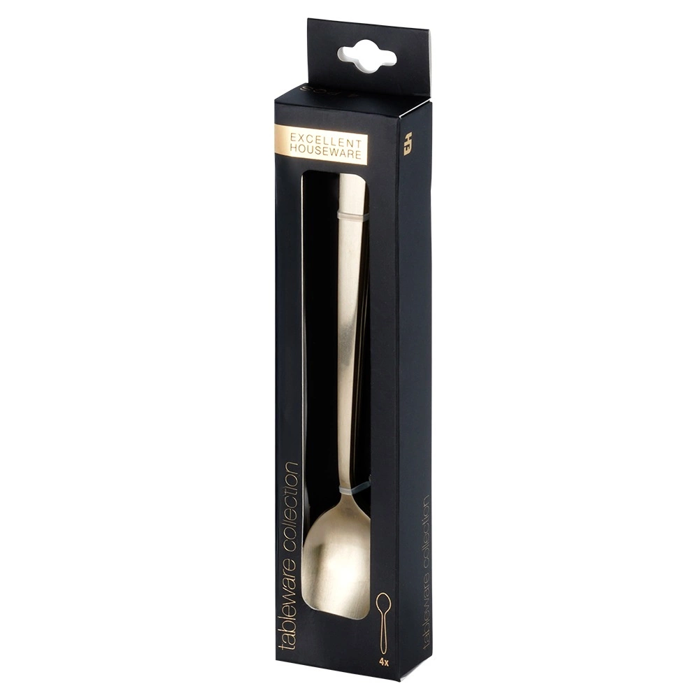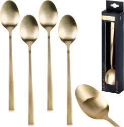 Stijlvolle set van vier lange cocktaillepeltjes van roestvrij staal met een goud satijnen afwerking. Ideaal voor latte, cocktails, desserts en drankjes in hoge glazen. De lepeltjes hebben afmetingen van 3 × 18 cm, zijn voedselveilig en vaatwasmachinebestendig.
