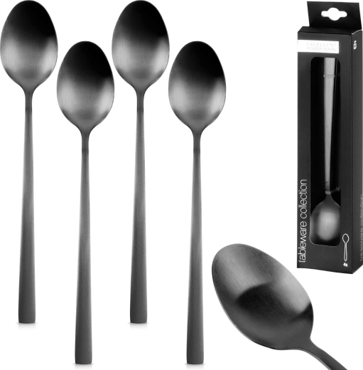 Stijlvolle set van vier lange cocktaillepels van hoogwaardig roestvrij staal in een matte zwarte afwerking. Ideaal voor hoge glazen, desserts en latte. Duurzaam roestvrij staal, satijnen oppervlak, vaatwasmachinebestendig en universeel gebruik voor thuis en in de horeca.