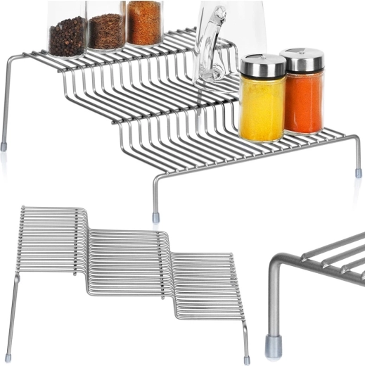 De drietraps opzetplank zorgt voor beter overzicht en directe toegang tot uw spullen – geen verborgen kruiden of mokken meer achterin de kast. De open draadconstructie van duurzaam metaal is stabiel, luchtig en makkelijk te onderhouden.