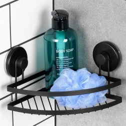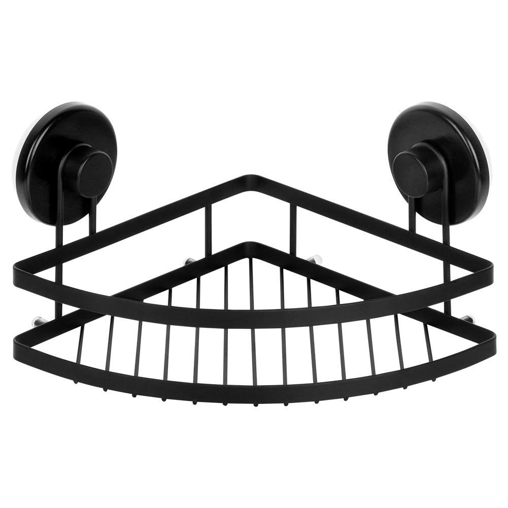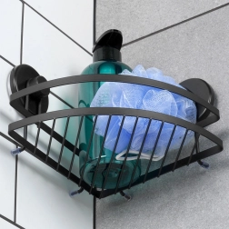 Deze hoekplank voor de douche combineert een minimalistisch design met hoge functionaliteit. Poedergecoat metaal in mat zwart is duurzaam, eenvoudig te reinigen en past perfect in zowel moderne als klassieke badkamers. Dankzij de twee grote zuignappen bevestig je hem veilig op gladde oppervlakken zoals tegels of glas – zonder boren en zonder schade aan de muren.