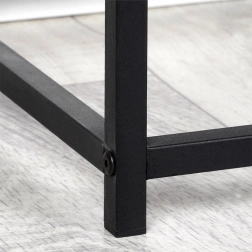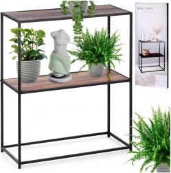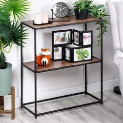 Dit tweelaags rek met afmetingen 70 × 30,5 × 85 cm is ideaal voor overzichtelijke opslag en stijlvolle presentatie van decoraties, boeken, planten of badkamer- en keukenaccessoires. Het robuuste metalen frame in zwart in combinatie met MDF-planken in houtdecor creëert een moderne industriële look die in de meeste interieurs past.
