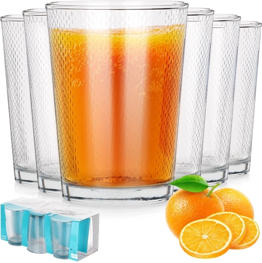 Elegante set van zes glazen met een inhoud van 425 ml, gemaakt van dikwandig glas met een gestructureerd oppervlak voor een zekere grip. Ideaal voor water, limonade, sappen en drankjes, geschikt voor de vaatwasser en perfect voor dagelijks gebruik thuis en in de horeca.