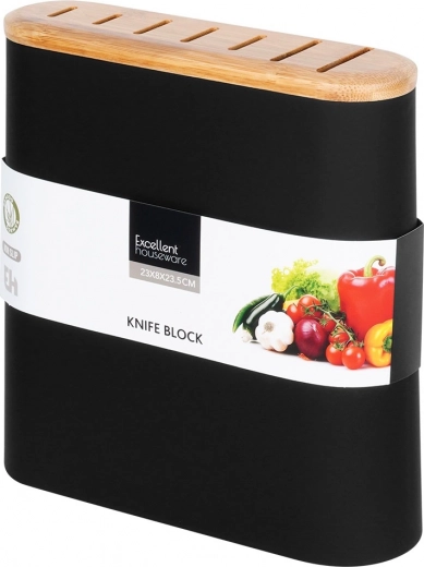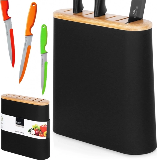 Stijlvolle en functionele messenstandaard met afmetingen 23 × 8 × 23,5 cm voor overzichtelijke, veilige en hygiënische opslag van messen – van staal tot keramiek en combinaties. De matte zwarte behuizing met aangename soft-touch afwerking en de bamboe bovenkant met sleuven vormen een tijdloze toevoeging aan elke keuken.