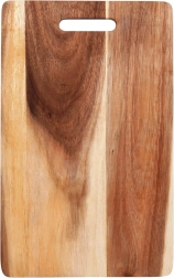 Rechthoekige plank van hoogwaardig acaciahout met hoge weerstand, stabiliteit en lange levensduur. Het natuurlijke oppervlak met een fraaie houttekening is vriendelijk voor messen en dempt dankzij de dikte van 1,5 cm schokken tijdens het snijden. De praktische handgreep maakt comfortabel dragen en ophangen mogelijk.