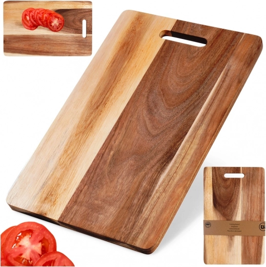 Praktische houten snijplank van acaciahout met afmetingen 36 × 23 cm en een dikte van 1,5 cm, ideaal voor dagelijks snijden én stijlvol serveren. Biedt bestendigheid tegen vocht, een natuurlijke tweekleurige houttekening en een ergonomische handgreep voor gemakkelijk dragen. Perfect voor het snijden van vlees, groenten en fruit en voor het serveren van kazen of hapjes.