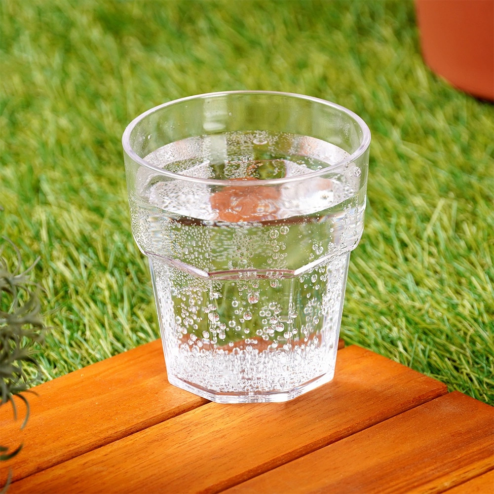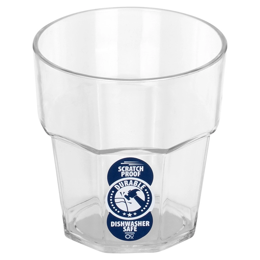 Praktisch glas met een inhoud van 275 ml, een hoogte van ca. 8,5 cm en een diameter van 8 cm, gemaakt van hoogwaardig helder acryl. Biedt een elegante glaslook met het voordeel van extra breukbestendigheid. Perfect voor water, limonade, sappen, mixdrankjes en ijsthee.