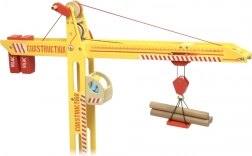 De set bevat bewegende figuurtjes van een kraanmachinist en een arbeider, een platform, een magnetische haak, diverse ladingen en verkeersborden om de werkzone af te bakenen – in totaal 12 stuks accessoires. Kwalitatieve materialen (massief hout, duurzaam multiplex, metalen onderdelen) en veilige verven zorgen voor langdurig en veilig speelplezier.
