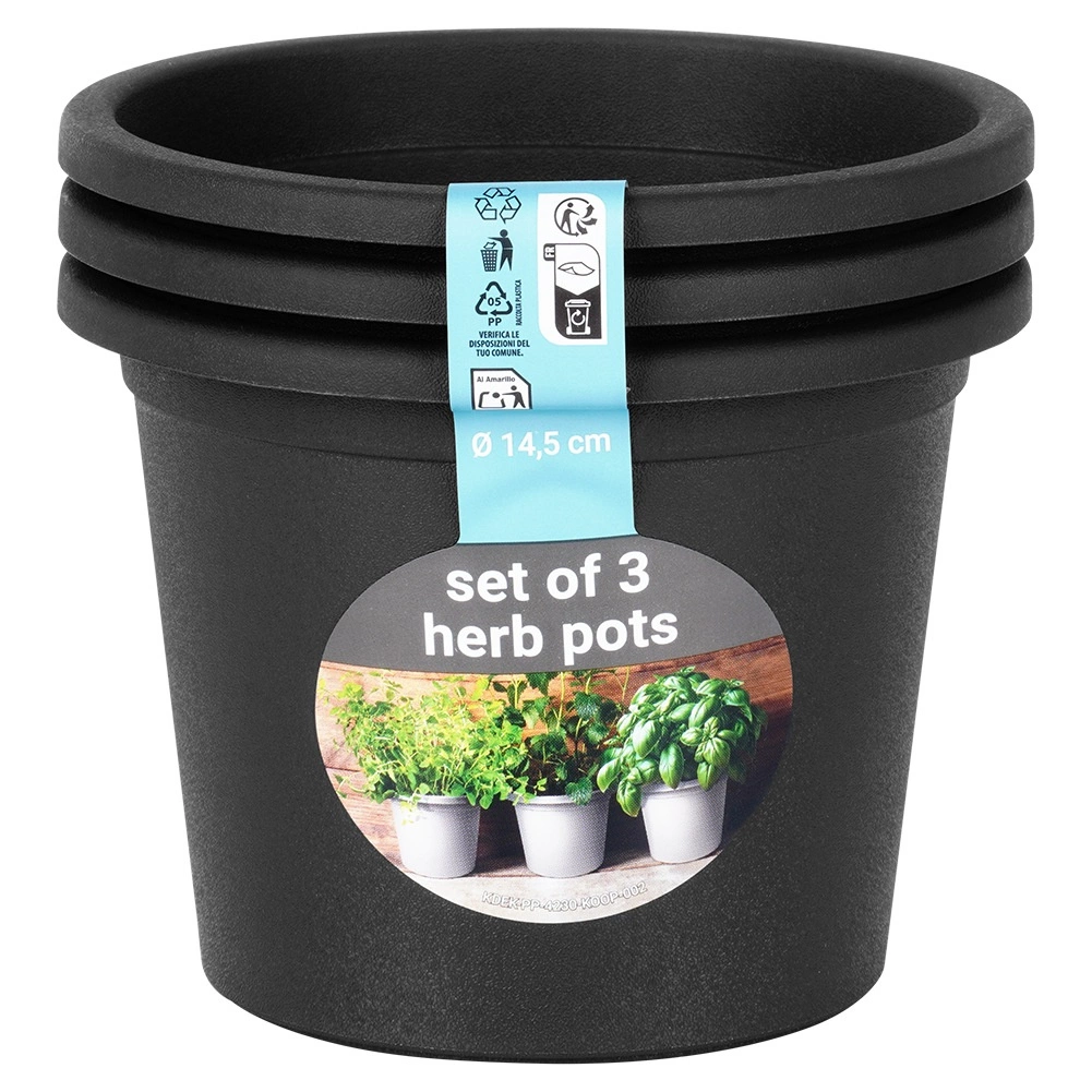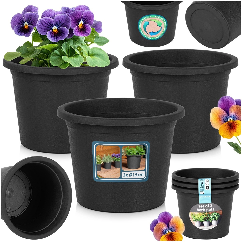 Set van 3 ronde bloempotten met een hoogte van ca. 11 cm (bovendoorsnede 14,5 cm, onderzijde ca. 10 cm) – ideaal om in te planten of om kweekpotten decoratief in te zetten. Minimalistisch zwart en strakke lijnen passen bij elke stijl en laten de plantenkleuren spreken.