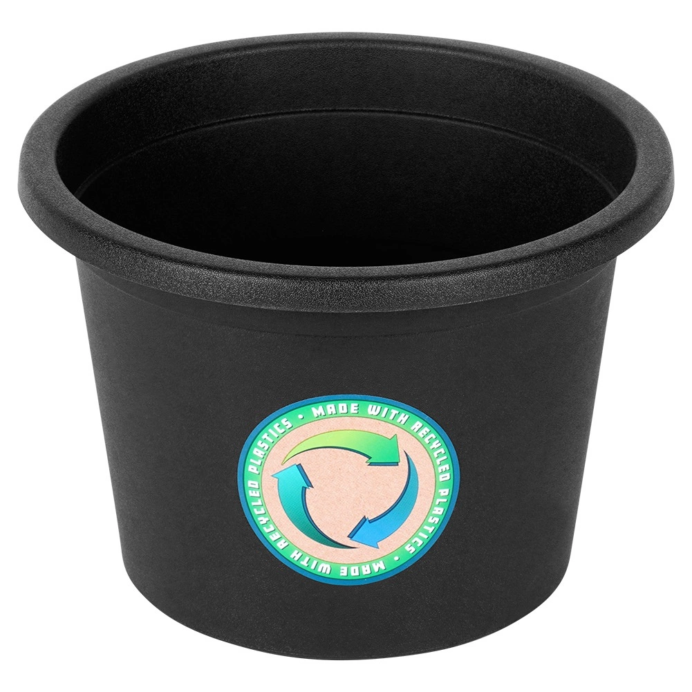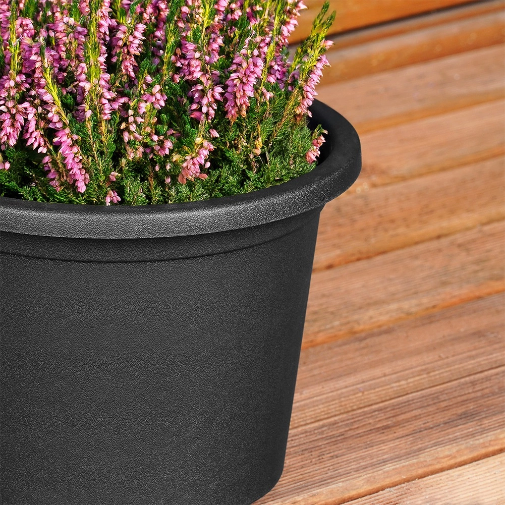 Het zwarte oppervlak accentueert de kleuren van de planten en zorgt voor universeel gebruik bij de voordeur, op het terras, balkon en in de tuin. Het materiaal is voor 90% gerecycled en de bloempot is volledig recyclebaar, wat hem tot een milieuvriendelijke keuze maakt. Eenvoudig onderhoud – vuil spoel je simpelweg af met water.