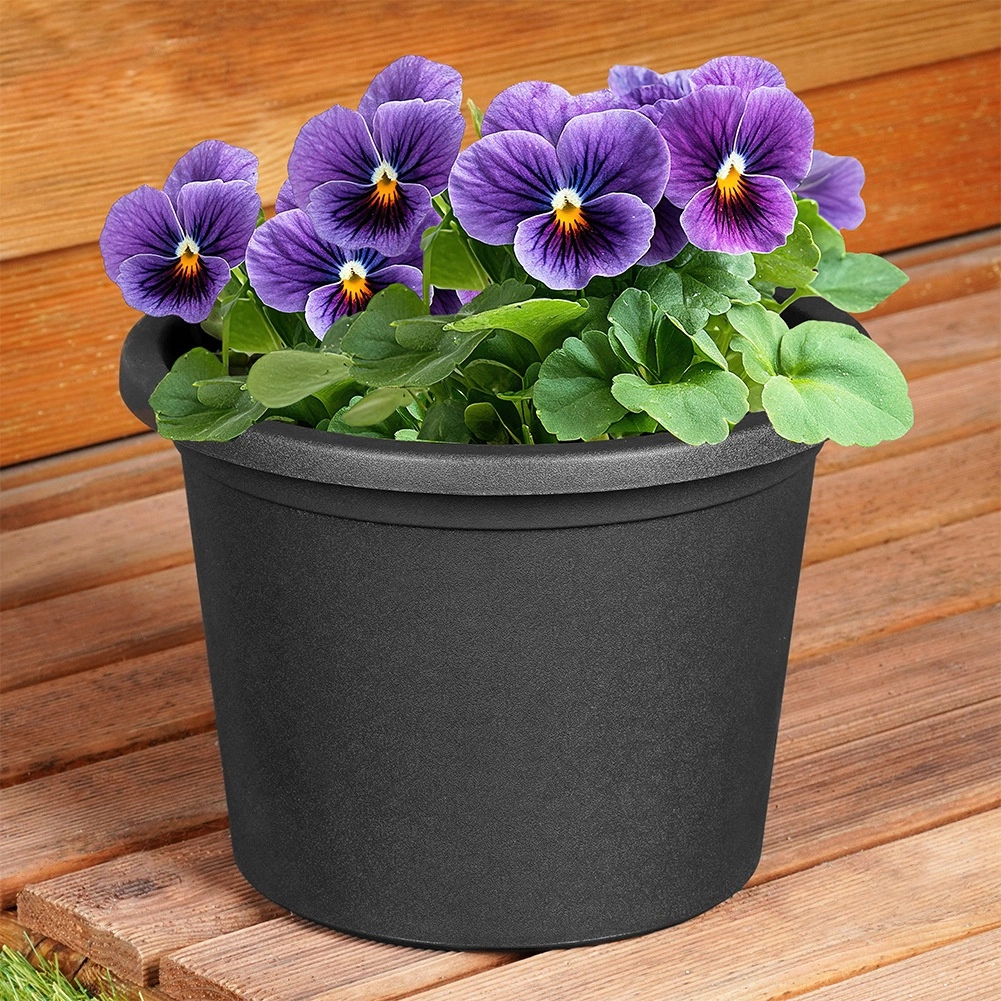 De klassieke ronde vorm en zwarte kleur passen op balkon, terras en bij de voordeur. Planten komen er prachtig in tot hun recht.
