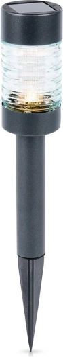 De lampbehuizing is gemaakt van roestvast staal gelakt in donkergrijs; de grondpen is van duurzaam zwart kunststof. De installatie is in een oogwenk gebeurd – simpelweg in de grond steken, zonder kabels en zonder gereedschap. De lamp wordt door de zon gevoed en is energiezuinig en milieuvriendelijk.