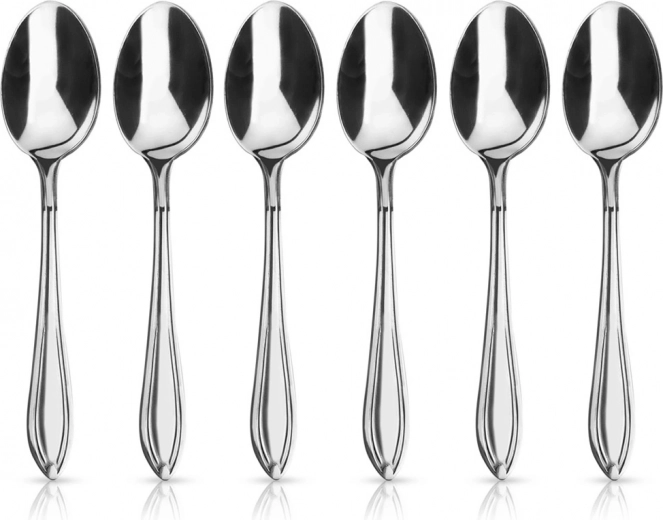 Praktische set van zes lepels die elke bestekset aanvult en de uitstraling van de tafel verhoogt. De glanzende afwerking oogt elegant en het universele design past bij zowel klassieke als moderne serviezen. Ideaal voor het serveren van koffie, thee en desserts.