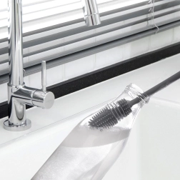 De slanke kop met een diameter van ca. 3 cm past gemakkelijk in flessen en karaffen en reinigt deze efficiënt bij de gootsteen.