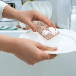 De zachte zijde neemt uitstekend op en reinigt mild, terwijl de sisallaag aangekoekt vuil effectief verwijdert zonder servies en oppervlakken te krassen.