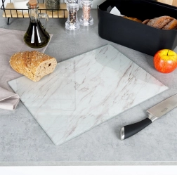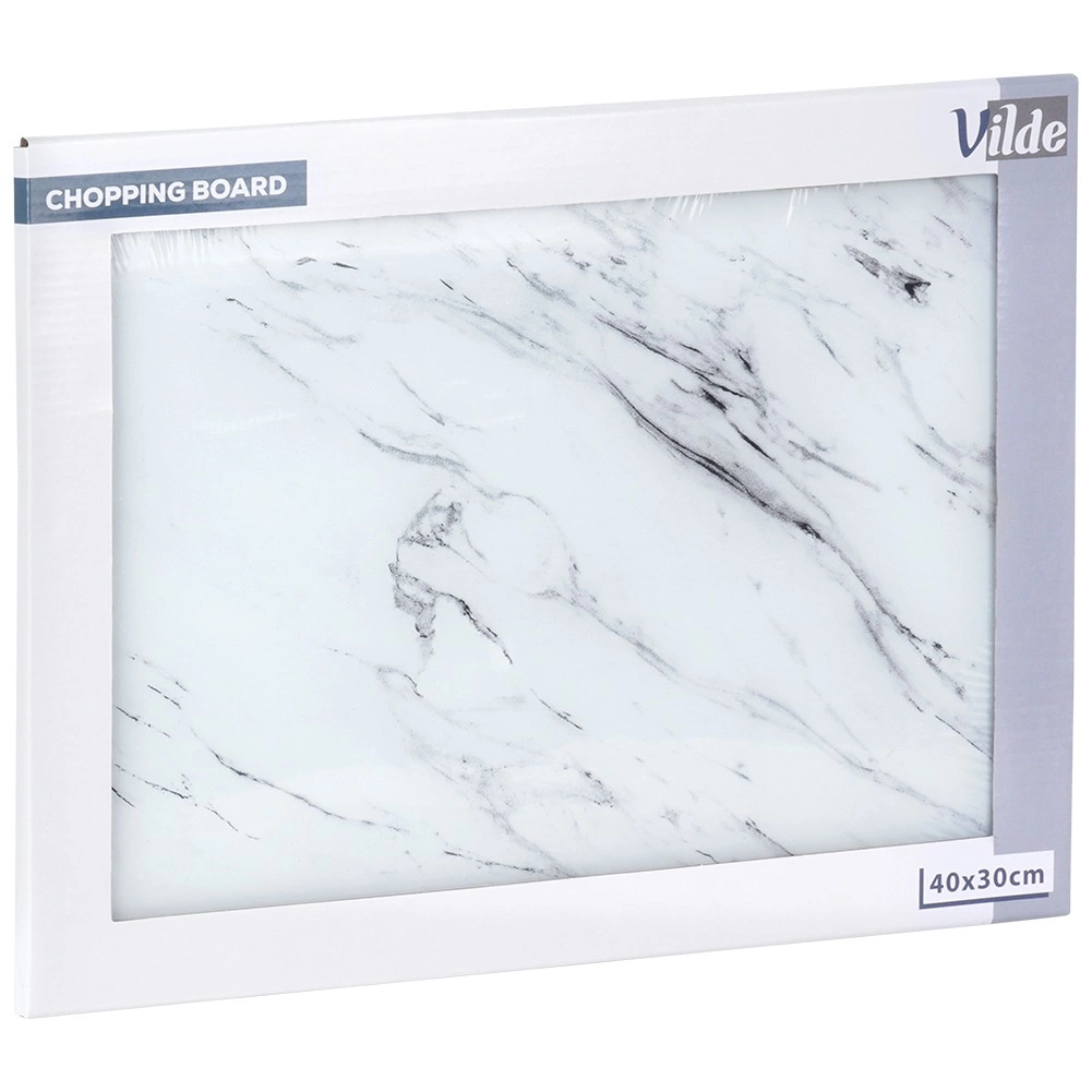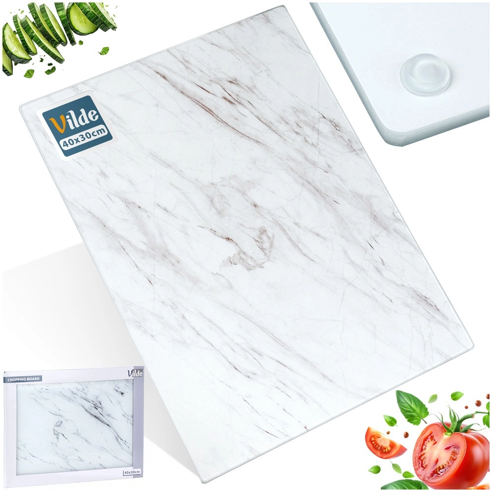 De glazen snijplank met modern marmerdecor is een stijlvolle toevoeging aan je keuken. Het geharde glas is glad, niet-poreus en eenvoudig schoon te houden, perfect voor hygiënische voedselbereiding. Dankzij het formaat van 40 × 30 cm biedt hij volop ruimte voor het snijden van brood, fruit, groenten en vlees.
