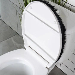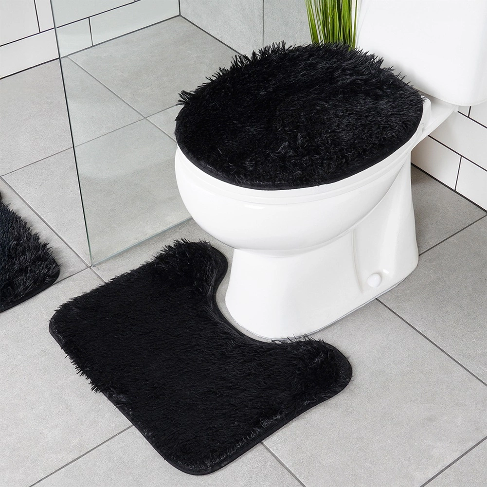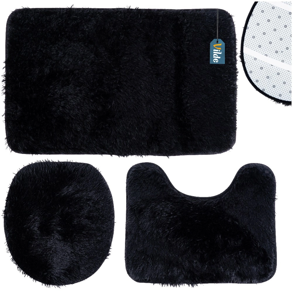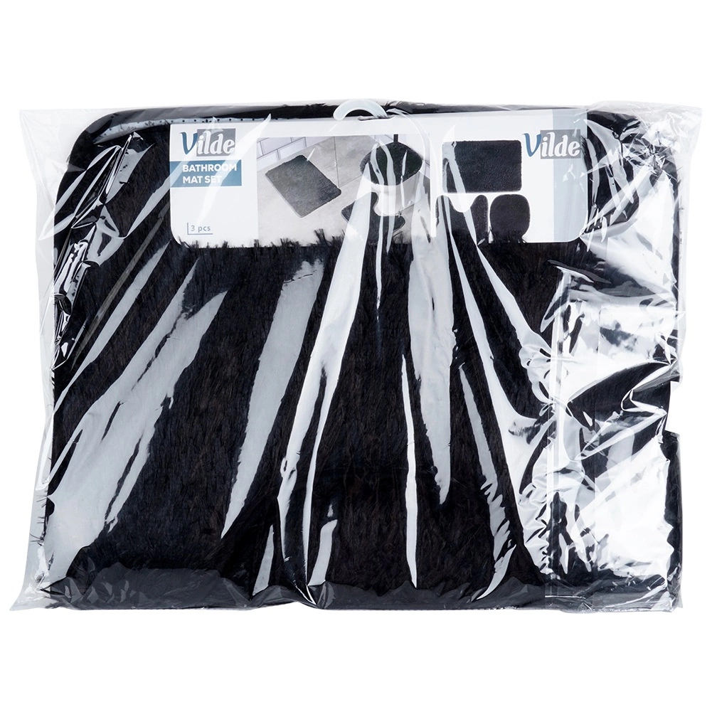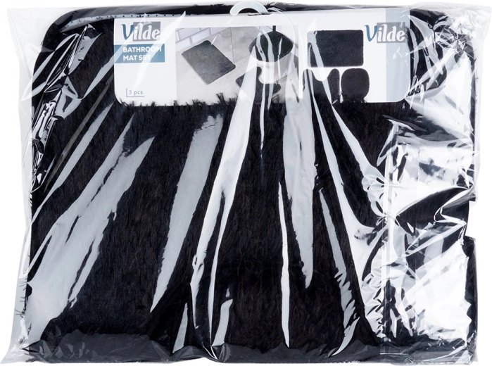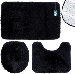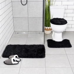 De set bevat een rechthoekige mat voor bad of douche, een U-uitsparing voor de toiletvoet voor een schone en comfortabele zone rond het toilet en een hoes voor de toiletbril met elastieken voor een stevige bevestiging. De minimalistische zwarte kleur past in elk interieur en accentueert het design van de badkamer.