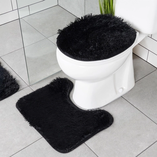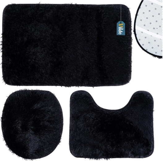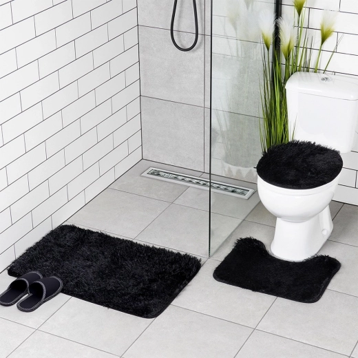 Elegante set van drie badkamermatten in het zwart voor dagelijks comfort en veiligheid. Bevat een rechthoekige mat, een U-uitsparing voor het toilet en een hoes voor de toiletbril. Zachte, pluizige polyestervezels geven een warm gevoel, terwijl de antislip onderzijde voor stabiliteit op de vloer zorgt. De matten zijn wasbaar tot 30 °C en passen perfect in zowel een moderne als klassieke badkamer.