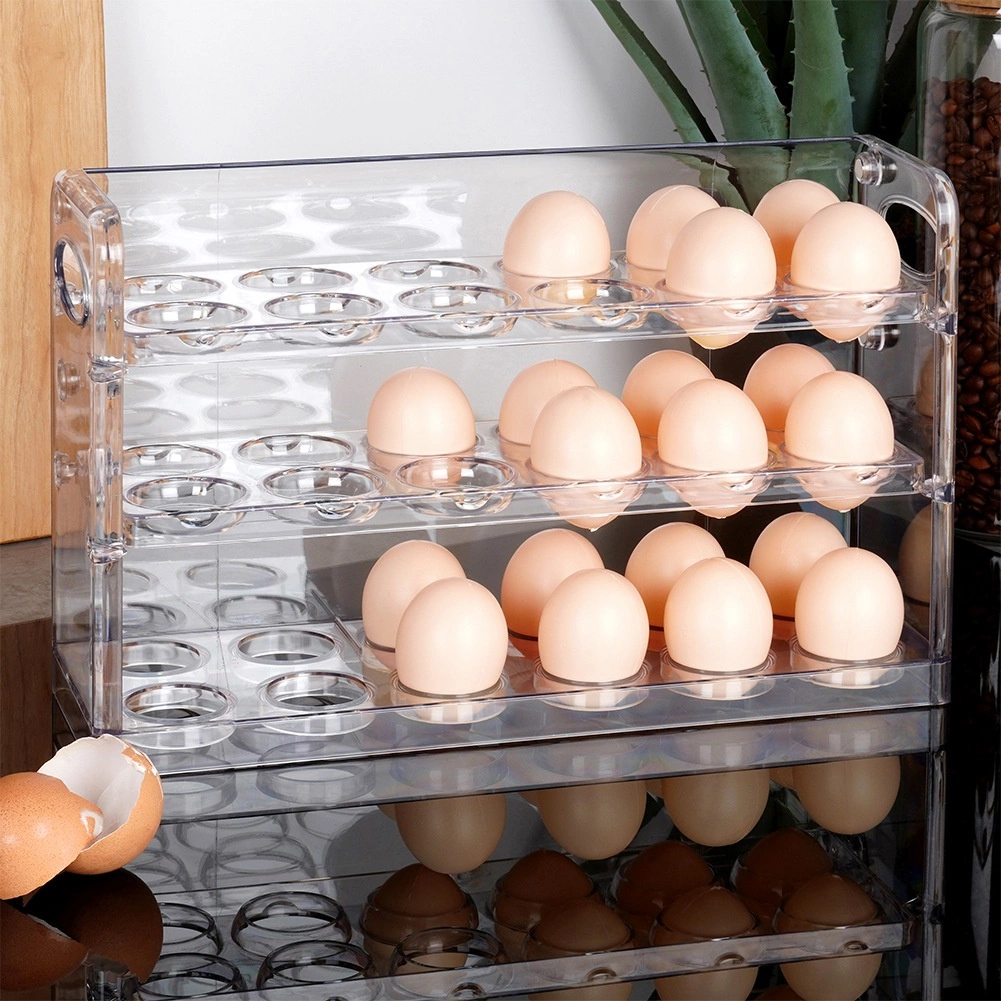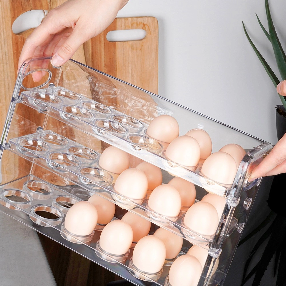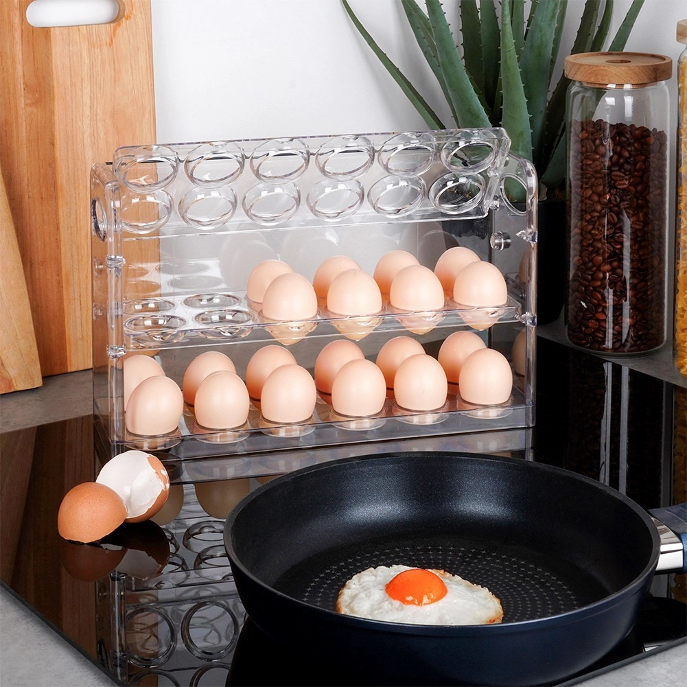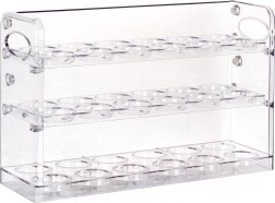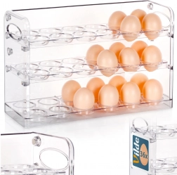 De doordachte driedelige oplossing biedt ruimte voor een grote voorraad eieren en bespaart tegelijk plaats in de koelkast. Elk niveau houdt veilig 12 stuks vast.