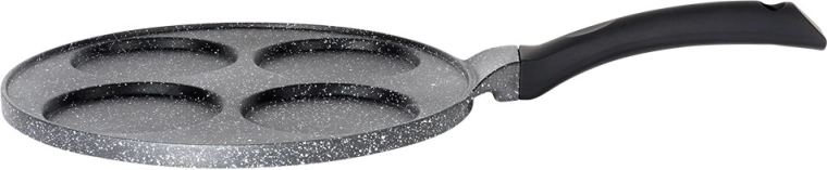 Praktische granieten koekenpan voor eieren en pannenkoekjes met vier vormen met een diameter van 9 cm zorgt voor een perfecte ronde vorm, antiaanbak bakken met minimale vetstof en een gelijke warmteverdeling. De ergonomische soft touch-greep wordt niet heet en ligt comfortabel en veilig in de hand. Geschikt voor alle soorten kookplaten, inclusief inductie en vaatwasserbestendig.