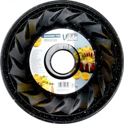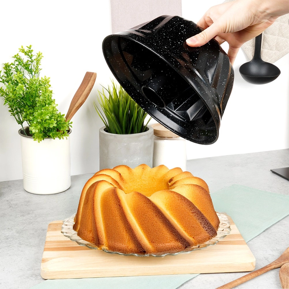 Deze tulbandvorm met schoorsteen is een betrouwbare keuze voor dagelijks bakken en feestelijke desserts. Dankzij de granieten antiaanbakafwerking blijft het deeg niet kleven en haal je de cake eenvoudig uit de vorm zonder de decoratieve ribbels te beschadigen. Het massieve koolstofstaal geleidt warmte efficiënt en ondersteunt een gelijkmatige garing van zowel kern als randen.