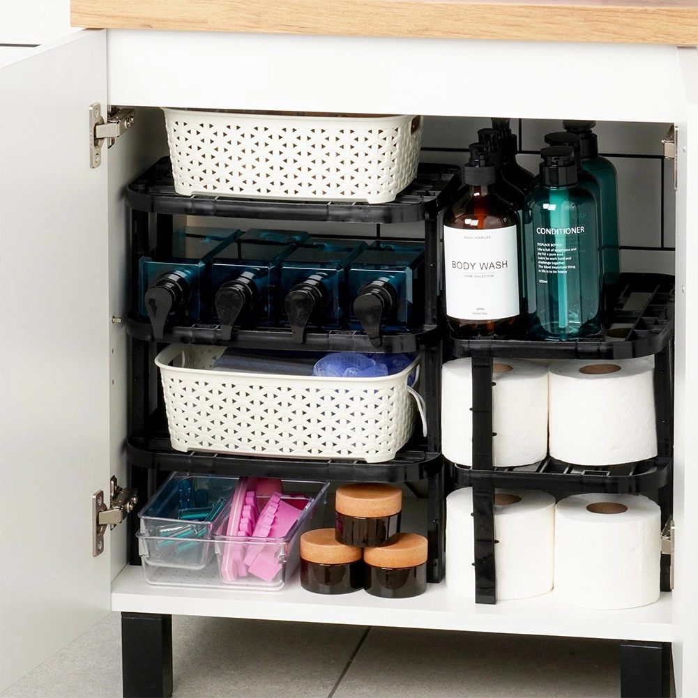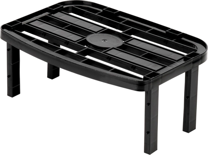 De robuuste kunststof constructie in zwarte kleur is stabiel, onderhoudsvriendelijk en dankzij de twee sets pootjes (13 cm en 10,5 cm) kies je een uiteindelijke hoogte van 14,5 cm of 11,5 cm. Het schap is geschikt voor keuken, voorraadkast, badkamer en kantoor en kan gestapeld worden om meerdere lagen opbergruimte te creëren.