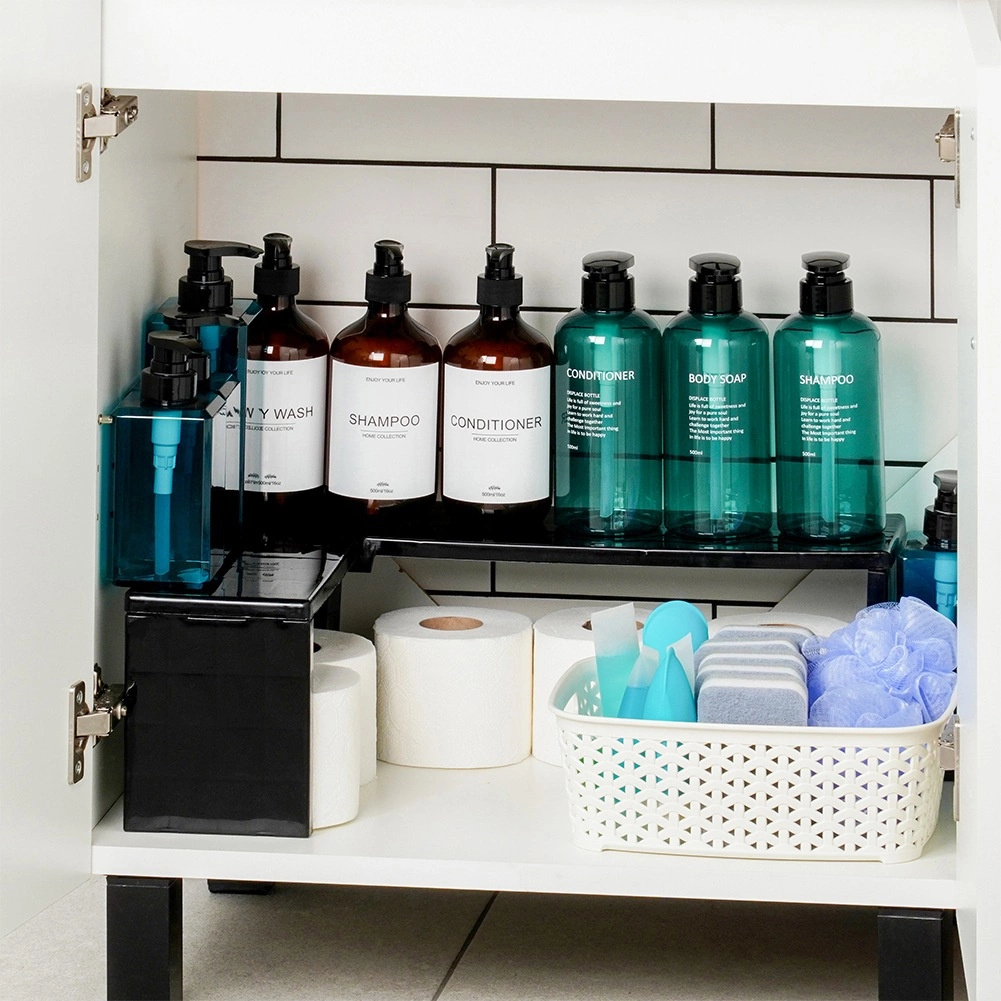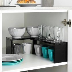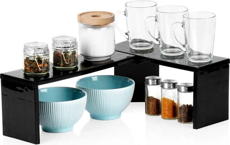 Praktisch hoekkeukenrek van duurzaam plastic helpt orde te houden en de ruimte op aanrecht en in kasten beter te benutten. Je kunt het gebruiken als hoekvariant of in de lengte, zodat je twee niveaus opbergruimte creëert voor kruidenpotjes, mokken, kommen of voorraadbussen. De stabiele constructie in elegant zwart past in keuken, voorraadkast, badkamer en kantoor.