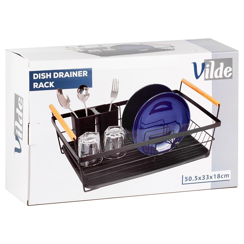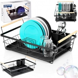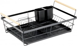 Twee houten handgrepen zorgen voor comfortabel dragen en geven het rek een elegante uitstraling die perfect past in moderne en klassieke keukens. De praktische constructie met een open draadframe zorgt voor snelle luchtcirculatie en efficiënt drogen.