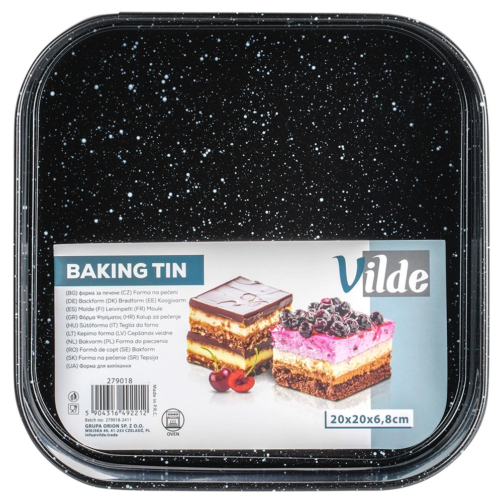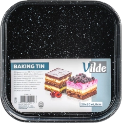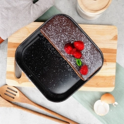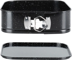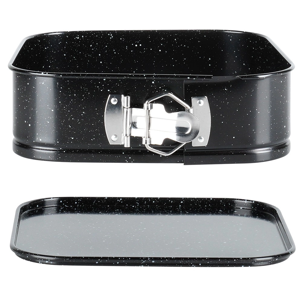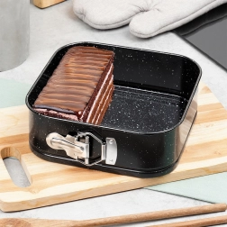 De vierkante vorm met afmetingen 20 × 20 × 6,8 cm is een uitstekende keuze voor dagelijks bakken. Het robuuste koolstofstaal zorgt voor stabiliteit en een gelijkmatige warmteverdeling, terwijl het granieten oppervlak aanhechten beperkt zelfs bij gebruik van weinig vet. Dankzij de springrand en de uitneembare bodem haal je het dessert eruit zonder de vorm te beschadigen.