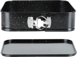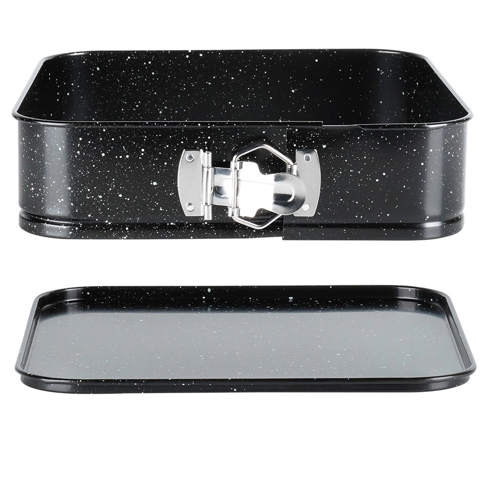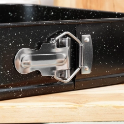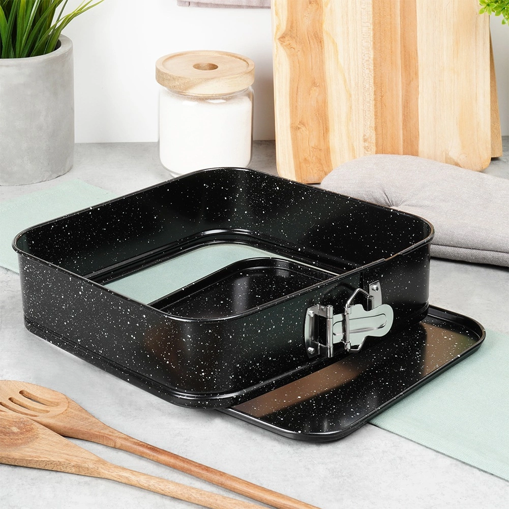 De vierkante springvorm van 24 × 24 × 6,8 cm is een betrouwbare keuze voor dagelijks bakken. Dankzij de openklapbare zijkanten en de uitneembare bodem haal je baksels er moeiteloos uit zonder vormverlies. De granieten anti-aanbaklaag vermindert de behoefte aan vet en vereenvoudigt het schoonmaken.