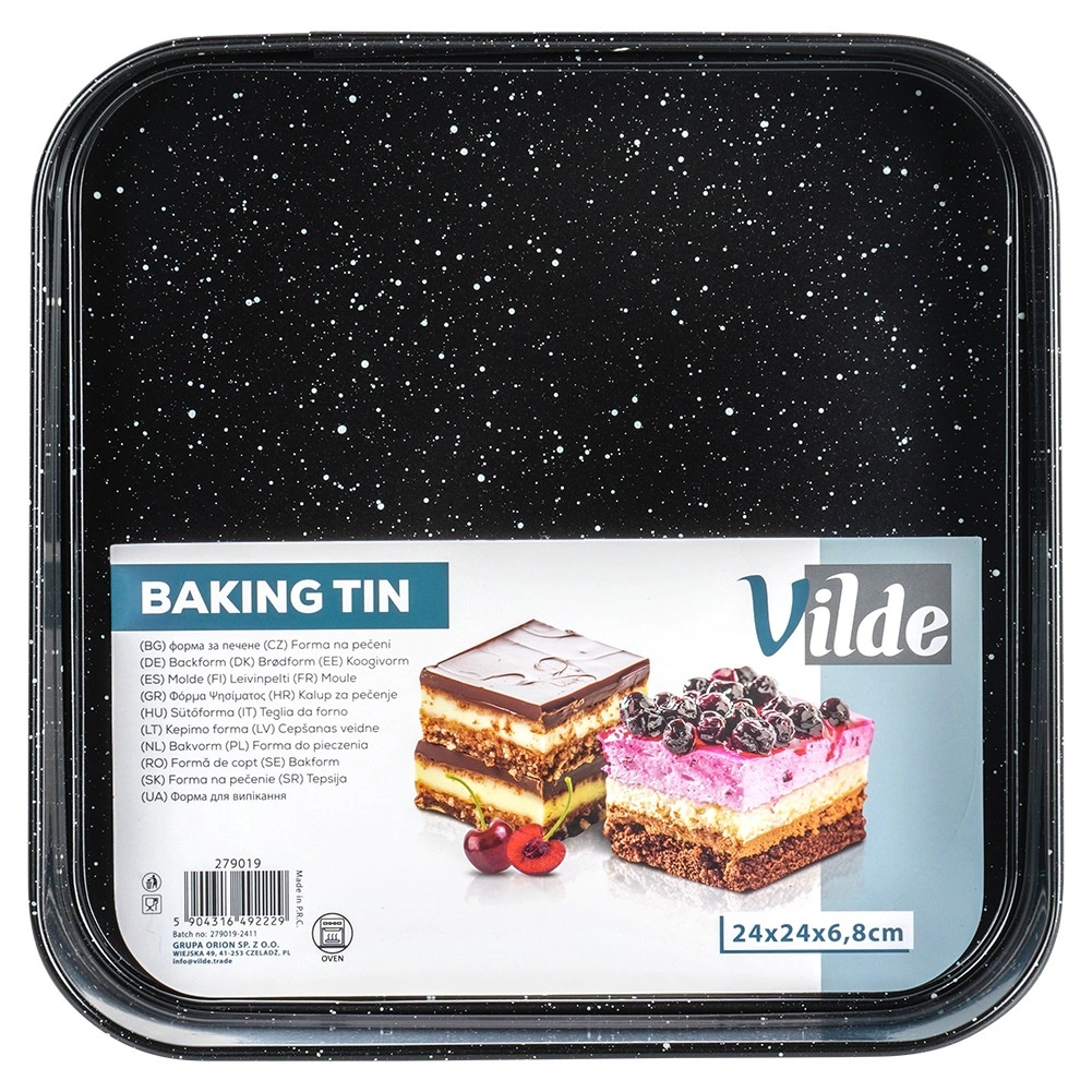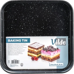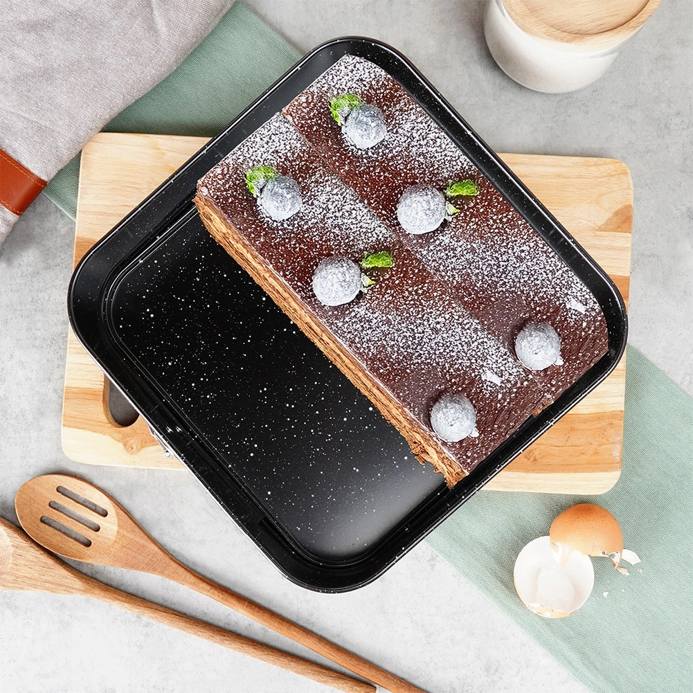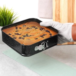 Het robuuste koolstofstaal zorgt voor een gelijkmatige warmteverdeling, is bestand tegen hoge temperaturen (tot 230 °C) en neemt geen geuren of vloeistoffen op. Geschikt voor gas- en elektrische ovens en dankzij de vierkante vorm perfect voor taarten, plakken, cheesecakes, taartbodems en hartige ovengerechten.