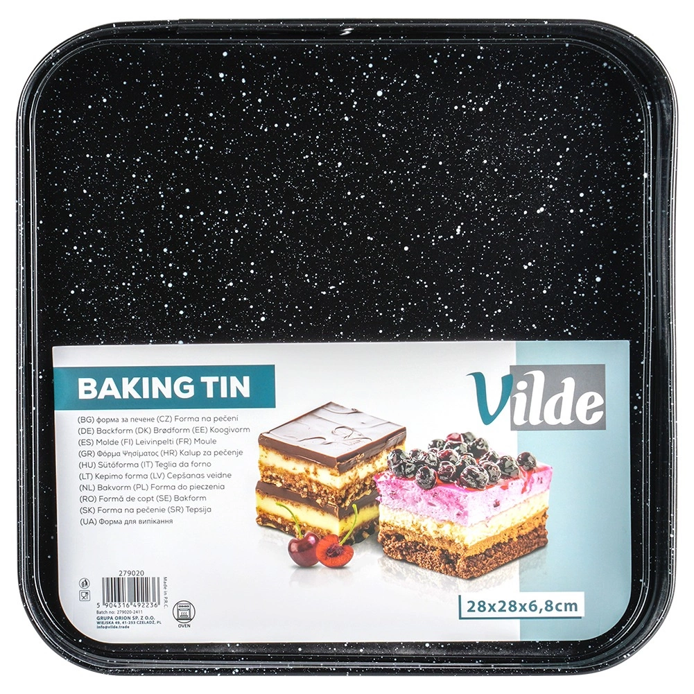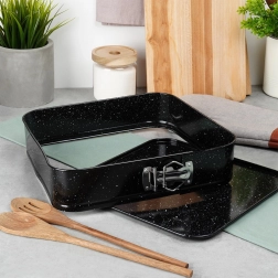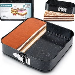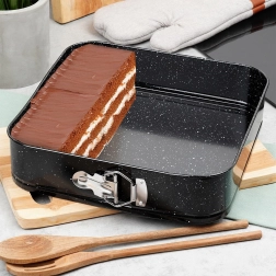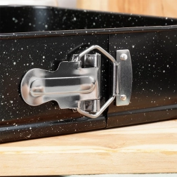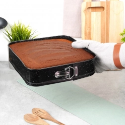 Deze vierkante uitschuifbare vorm van 28 × 28 × 6,8 cm is een uitstekende keuze voor dagelijks bakken. De behuizing van hoogwaardig koolstofstaal met een granieten coating zorgt voor optimale warmteverdeling en vermindert aanbranden. Je opent de vorm eenvoudig met de zijklemsluiting en dankzij de uitneembare bodem haal je het gebak er zonder vervormen uit.