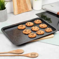 De speciale granietcoating voorkomt aankoeken en maakt het losmaken van gerechten eenvoudig, zodat je gebakken koekjes of friet gemakkelijk van de plaat haalt en het schoonmaken in een handomdraai gebeurt.