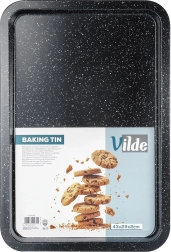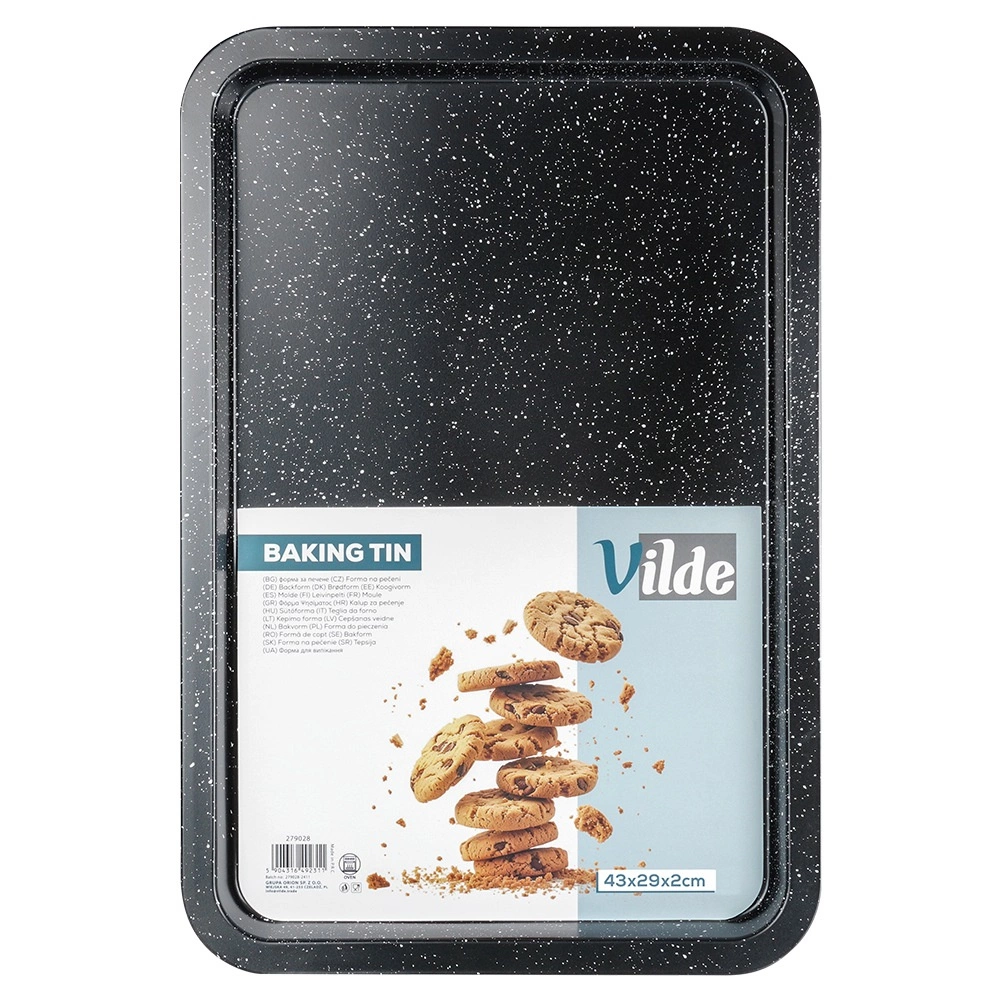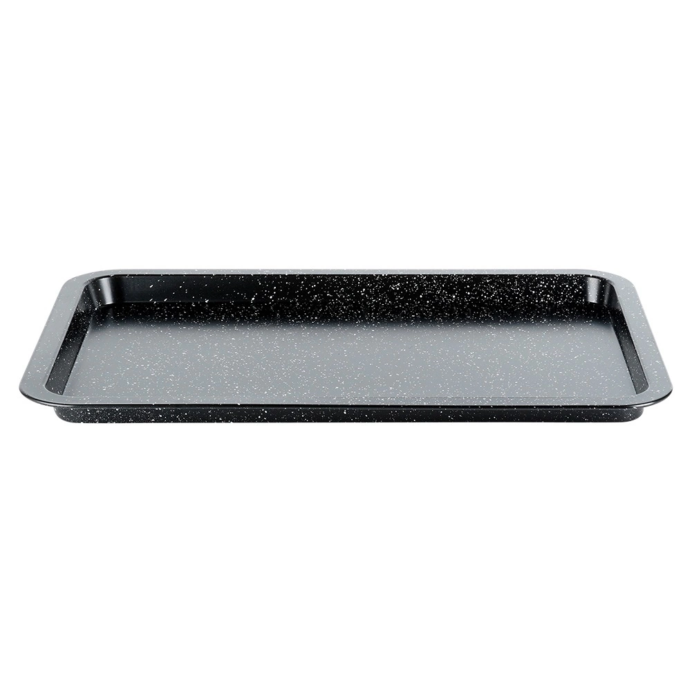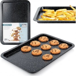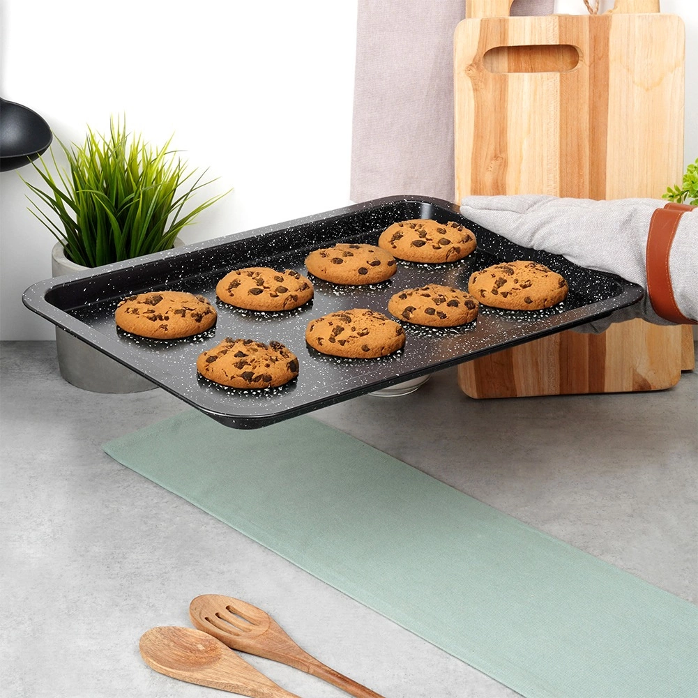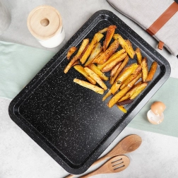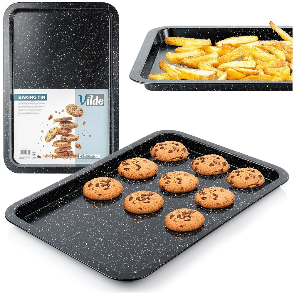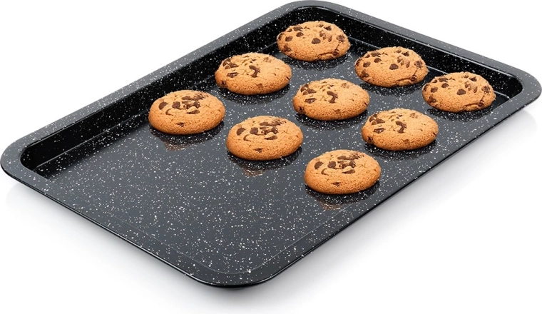 Duurzame bakplaat van hoogwaardig koolstofstaal met granieten coating is een uitstekende keuze voor zowel zoete als hartige gerechten. Het anti-aanbakoppervlak minimaliseert de behoefte aan vet en zorgt voor eenvoudig lossen van gerechten en makkelijke reiniging. Het materiaal is hittebestendig tot 230 °C en geschikt voor gas- en elektrische ovens.