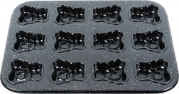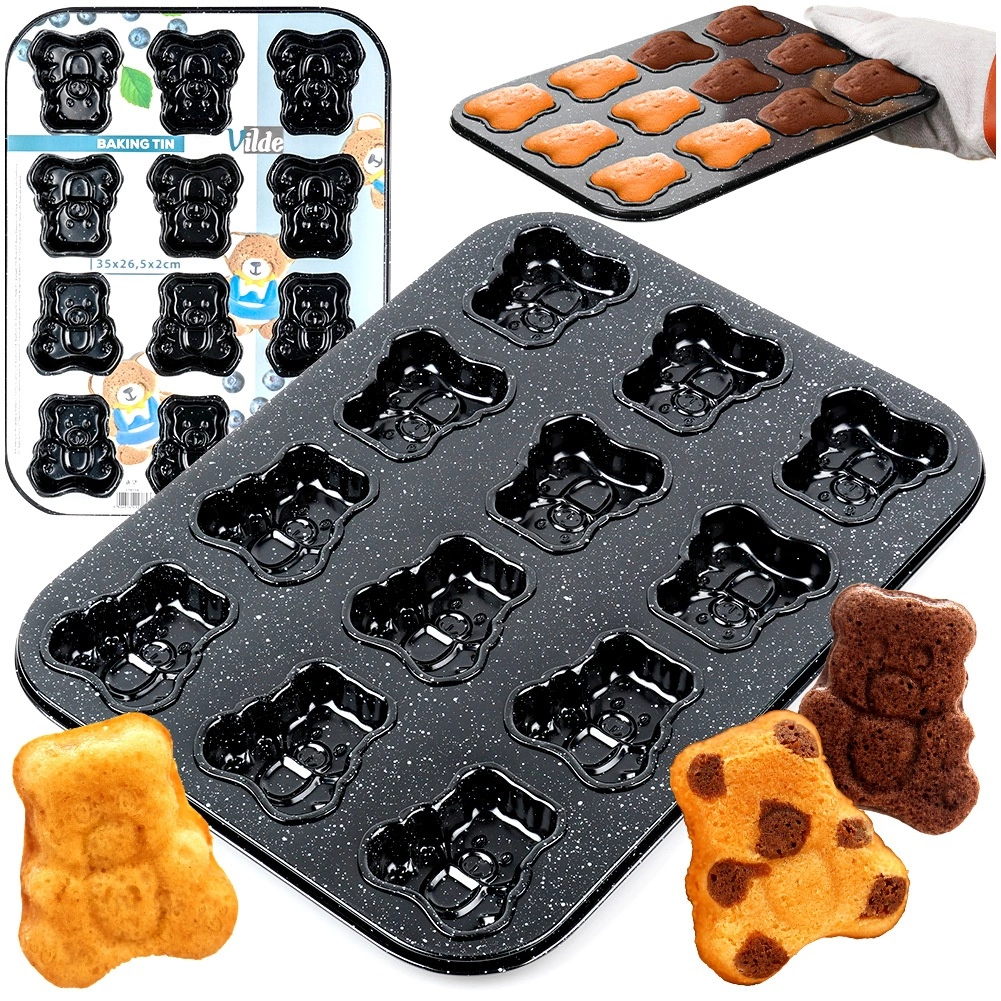 Maak speelse koekjes of mini muffins met perfecte details dankzij de vorm van hoogwaardig koolstofstaal met een granieten antiaanbakafwerking. De vorm van 35 × 26,5 × 2 cm biedt plaats aan 12 porties, elk in de vorm van een beertje van ongeveer 6,5 × 6 cm. Het materiaal geleidt warmte uitstekend en bakt gelijkmatig, zodat je lekkernijen mooi gaar zijn en gemakkelijk lossen.