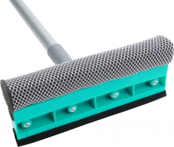 De gestructureerde spons met netlaag maakt vuil los en de rubberen strip trekt water perfect af zonder strepen – alles in één compacte kop.