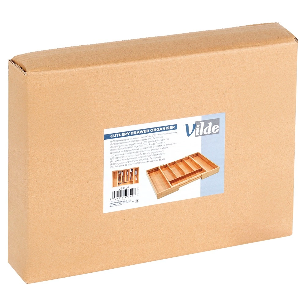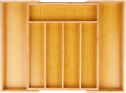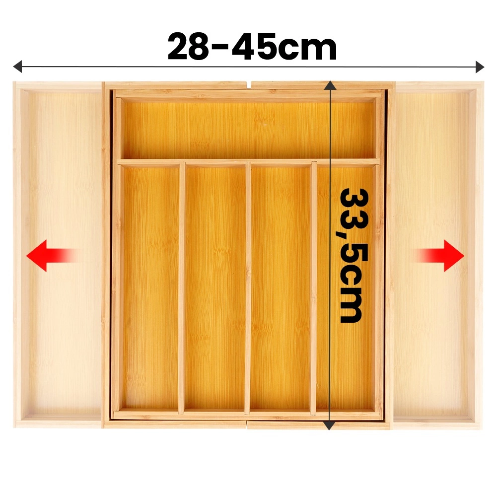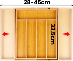 Breng voorgoed orde in je lade. De uitschuifbare bamboe bestekbak pas je eenvoudig aan de breedte van je lade aan van 28 tot 45 cm, zodat hij perfect past in verschillende soorten keukenkasten. De stevige constructie van natuurlijk bamboe is duurzaam, hygiënisch en gemakkelijk te reinigen.