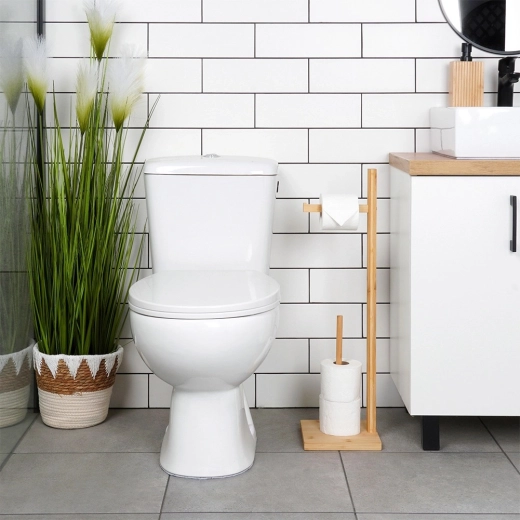 Elegante bamboe toiletpapierhouder met een hoogte van 70 cm, voorzien van een dispenser voor de huidige rol en opbergruimte voor maximaal 3 reserverollen. Dankzij de stabiele vierkante voet van 19 × 19 cm is hij stevig en veilig, zonder boren te plaatsen en gemakkelijk te verplaatsen. Natuurlijke bamboe geeft de badkamer een moderne, decoratieve uitstraling en bespaart ruimte, ook in kleinere interieurs.