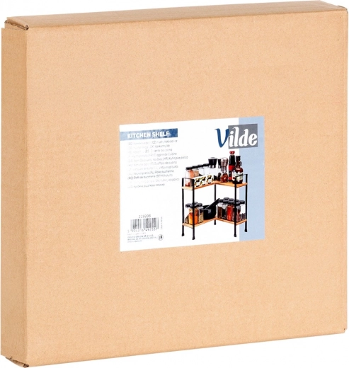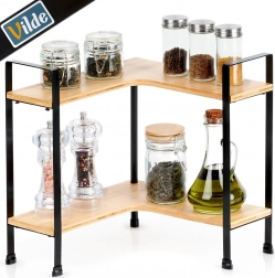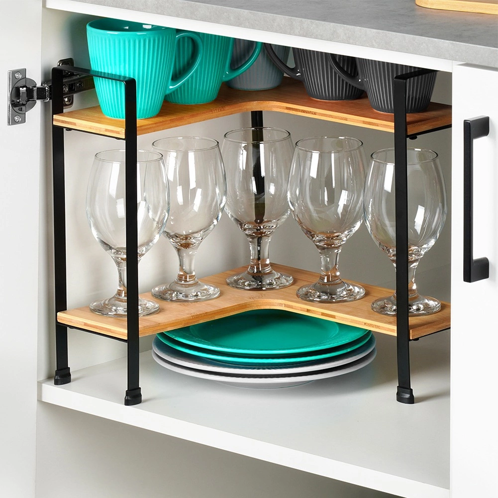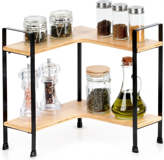 Dit elegante en praktische hoekrek helpt de ruimte op het keukenblad en in kasten maximaal te benutten. De L‑vormige constructie past precies in de hoek, terwijl twee etages zorgen voor overzichtelijke opslag van kruiden, glazen en kleine accessoires. De combinatie van natuurlijk bamboe en zwart metaal geeft de keuken een moderne uitstraling.