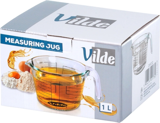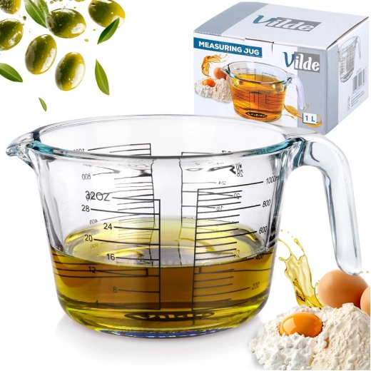Praktische glazen maatbeker met een inhoud van 1 l, met ergonomisch handvat en schenktuit voor makkelijk gieten. Dankzij de duidelijke schaalverdeling in ml en fl oz meet je vloeistoffen nauwkeurig en comfortabel af. Gemaakt van borosilicaatglas, bestand tegen thermische schokken, geschikt voor de vaatwasser, magnetron en oven.
