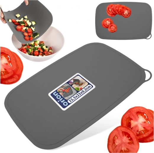 Praktische elastische snijmat van hoogwaardig kunststof in grijs met afmetingen 33,5 × 23 × 0,1 cm. Dankzij het flexibele ontwerp schuift u gesneden ingrediënten gemakkelijk rechtstreeks in een kom of pan; de mat is stil, licht en spaart de snijranden van messen. Vaatwasmachinebestendig en hittebestendig tot +95 °C. ORION kwaliteit voor elke keuken.