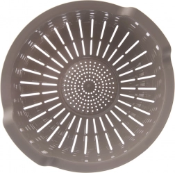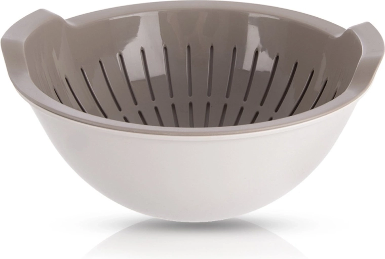 De zeef wordt in de kom opgeborgen en bespaart ruimte. Brede randen en handgrepen zorgen voor een zekere grip en stabiliteit tijdens het afgieten.