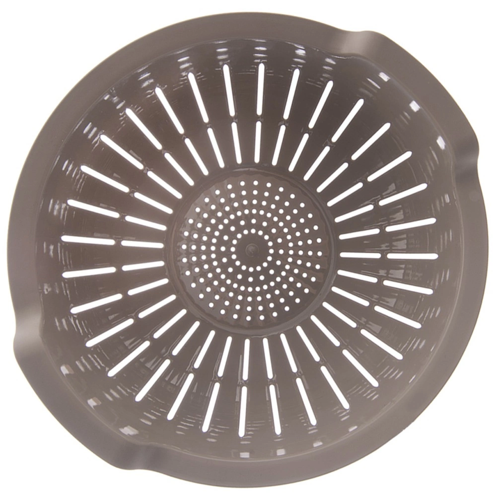 Je spoelt de binnenzeef af en plaatst die terug in de kom, waar het water veilig wegloopt zonder knoeien op het aanrecht.