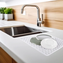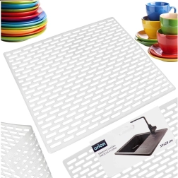 De universele afmeting 33 × 28 cm en de neutrale witte kleur passen gemakkelijk bij de meeste keukengootstenen en -stijlen. De mat is waterbestendig, eenvoudig te reinigen en de antislipstructuur verhoogt de veiligheid tijdens het afwassen.